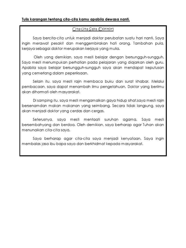 Cita-cita saya karangan darjah empat setiap orang ada cita-cita oleh itu saya kena ada cita-cita. Pertama sekalisaya ingin menyatakan definisi tajuk pidato saya pada pagi yang mulia ini iaitu kepentingan kegiatan kokurikulum. Pula kerjaya sebagai doktor merupakan kerjaya yang mulia.